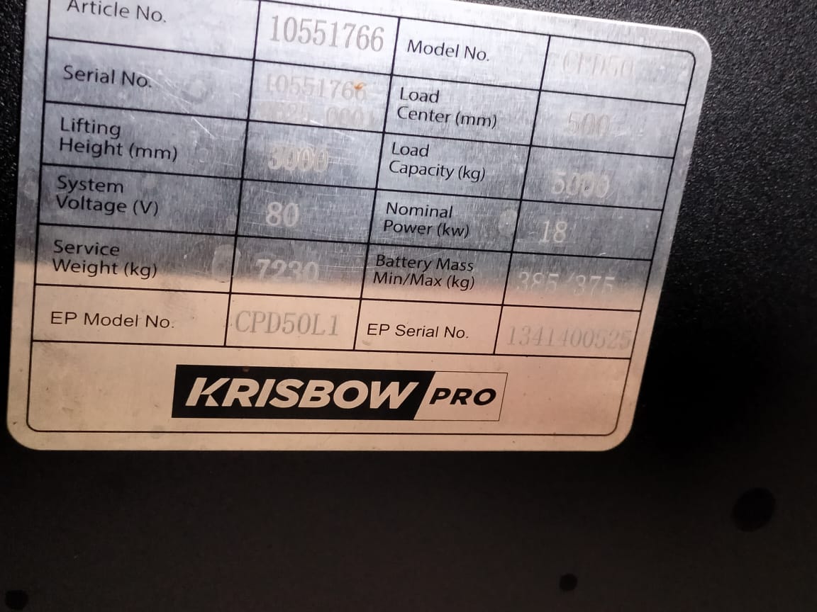 Krisbow Pro forklift electric CPD50L1 merupakan unit forklift listrik kelas berat dengan kapasitas angkat hingga 5.000 kg (5 ton). Dengan dukungan baterai lithium berkapasitas besar, teknologi keselamatan modern, dan fitur telematik canggih, unit ini menjadi solusi tepat untuk perusahaan yang membutuhkan forklift bertenaga tinggi namun tetap ramah lingkungan dan efisien.