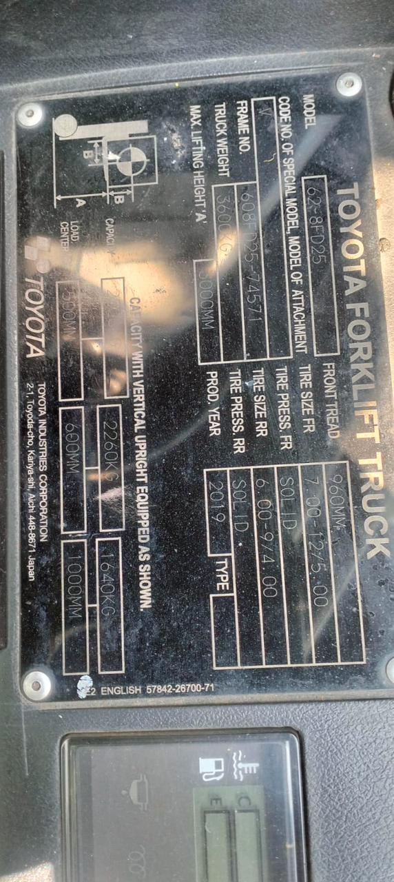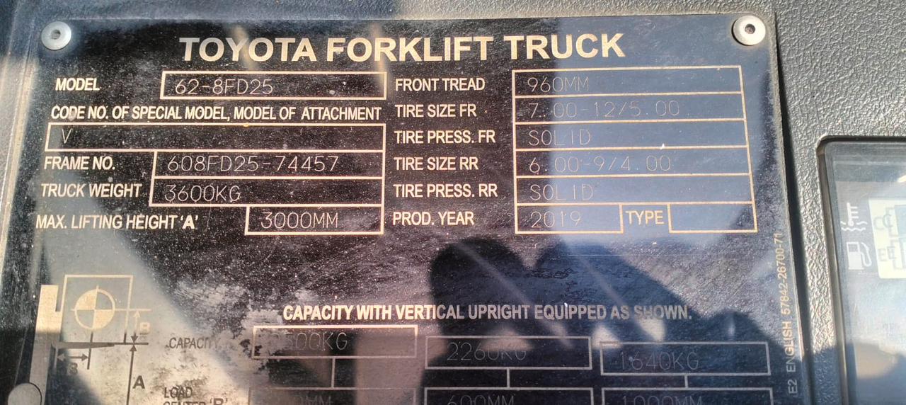 Toyota Forklift 62-8FD25 merupakan forklift diesel dengan kapasitas angkat 2,5 ton yang diproduksi pada tahun 2019. Unit ini termasuk dalam seri forklift Toyota yang dikenal tangguh, efisien, serta aman digunakan di berbagai sektor industri seperti logistik, gudang, manufaktur, dan konstruksi.