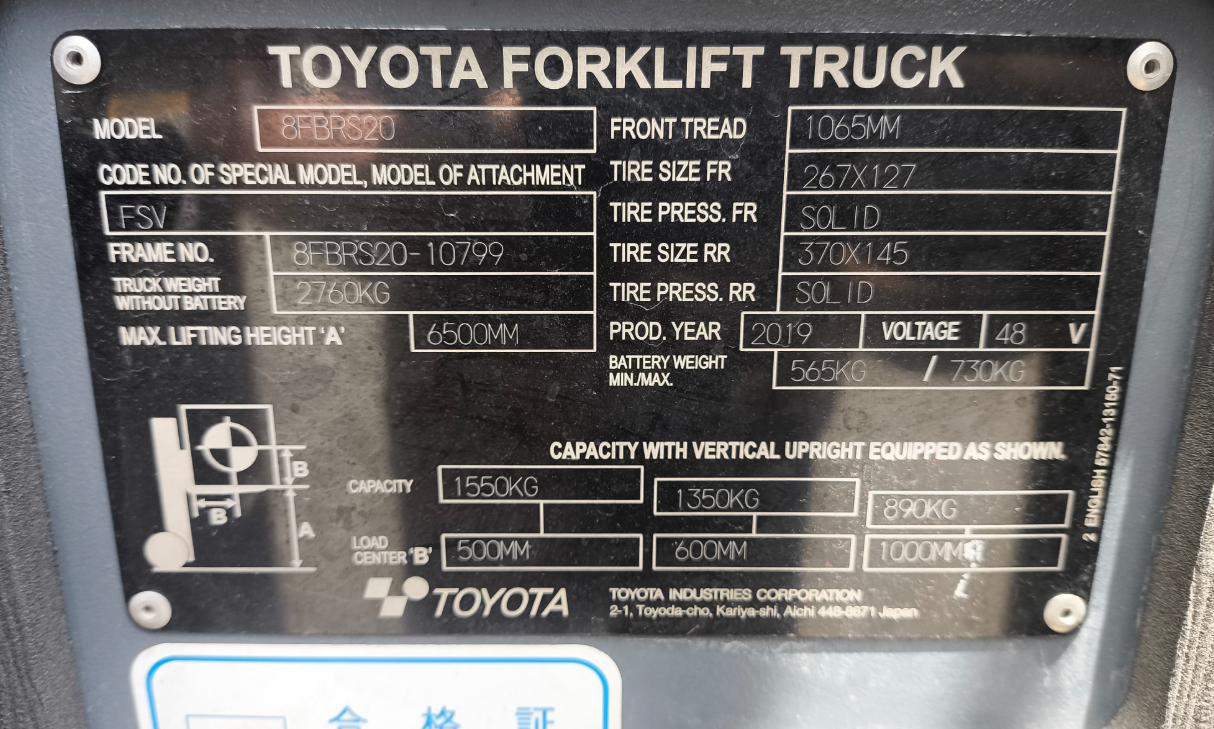 Toyota Reach Truck 8FBRS20 memiliki kapasitas angkat bervariasi tergantung pada pusat beban:
